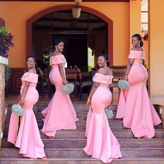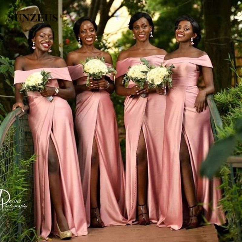 Off Shoulder Boat Neck Pink Satin Bridesmaid Dresses African Wedding Party Dresses With Gold Appliques Leg Slit Evening Party Dresses